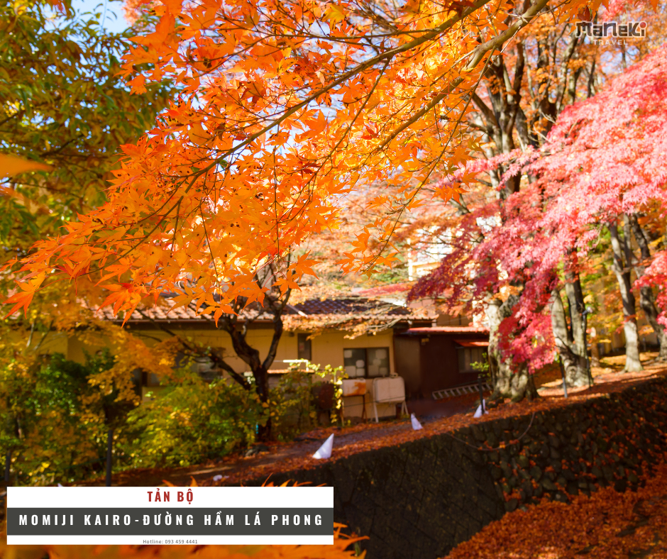 - Đường hầm lá phong – Momiji Kairo: (đối với các đoàn từ cuối tháng 11, tuỳ thuộc vào tình trạng đổi màu của lá) Nằm ở bờ phía bắc của hồ Kawaguchiko, dọc theo con sông cũ. Bản chất nơi đây là một con đường đi bộ dài ven sông, nơi những cây phong, hay trong tiếng Nhật gọi là “momiji”, được trồng dọc hai bên đường. Mùa thu, những chiếc lá phong này chuyển sang màu đỏ, cam và rơi xuống đất. Những tán cây đỏ cam rực rỡ ôm lấy con đường trông giống như một đường hầm nên địa điểm này còn được biết đến với tên gọi “đường hầm lá phong”
